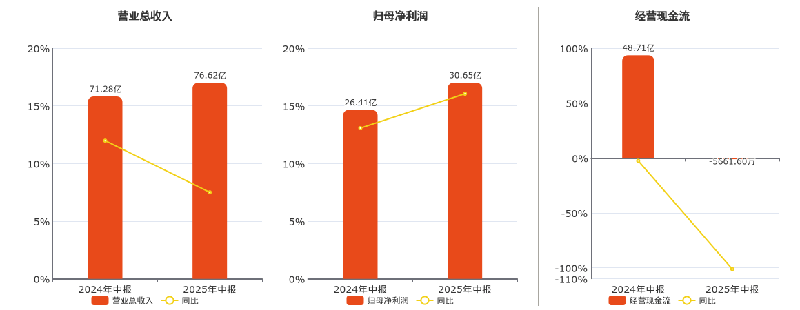 公司营业总收入为76.62亿元。归母净利润为30.65亿元,在已披露的同业公司中排名第9。经营活动现金净流入为-5661.60万元,在已披露的同业公司中排名第12,较去年同报告期经营活动现金净流入减少49.27亿元,同比较去年同期下降101.16%。