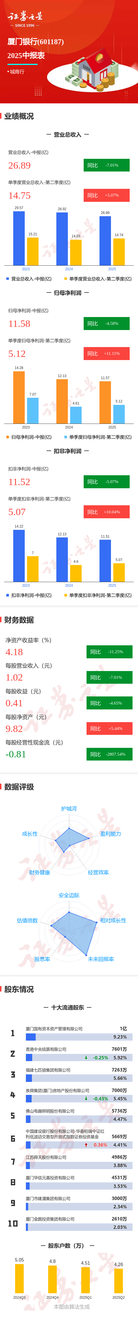 证券之星消息,厦门银行2025年中报显示,公司主营收入26.89亿元,同比下降7.02%;归母净利润11.58亿元,同比下降4.59%;扣非净利润11.52亿元,同比下降5.07%;其中2025年第二季度,公司单季度主营收入14.75亿元,同比上升5.08%;单季度归母净利润5.12亿元,同比上升11.11%;单季度扣非净利润5.07亿元,同比上升10.04%;负债率92.47%,投资收益6.71亿元。