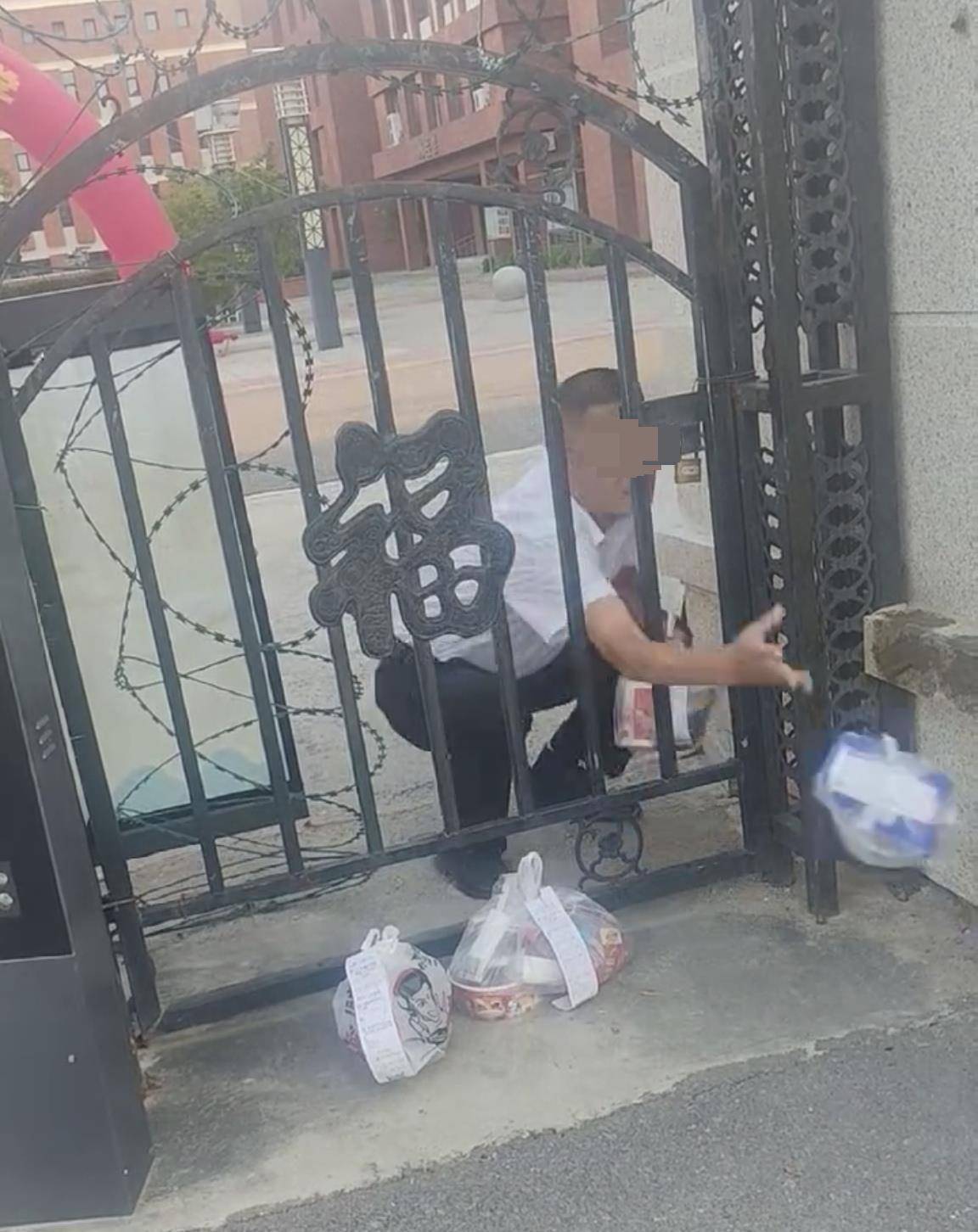 视频显示,在教学楼旁边的铁门下方,地上放置有五六份外卖,门内一名男子将其中几份提起扔向门外,其中还包括一杯饮品。剩下的几份由门外的一名身穿保安制服的男子拎起放到了镜头外的附近。