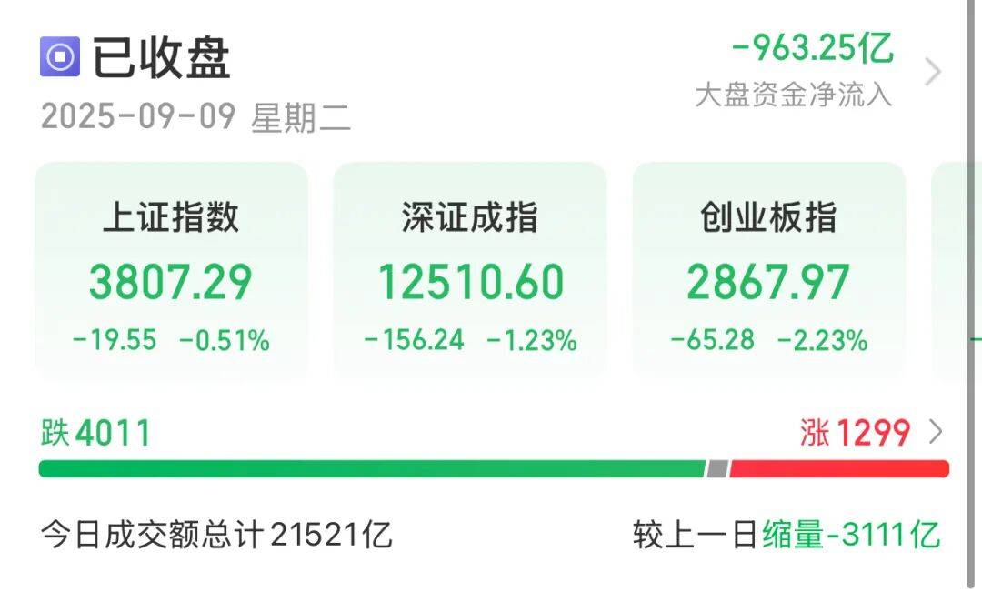 9月9日,A股三大股指集体收跌。截至收盘,上证指数跌0.51%,深证成指跌1.23%,创业板指跌2.23%,北证50跌2.1%。沪深京三市全天成交额21521亿元,较上日缩量3111亿元。全市场超4000只个股下跌。