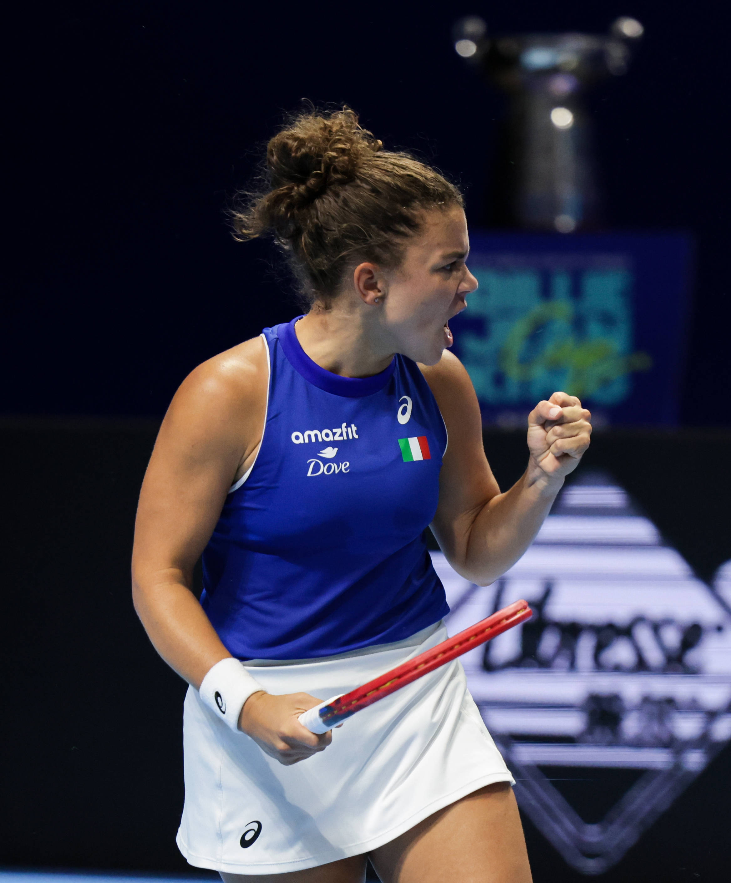9月16日,意大利队选手保利尼在第二场单打比赛中庆祝得分。最终她2比1战胜中国队选手王欣瑜。 新华社记者 毛思倩 摄