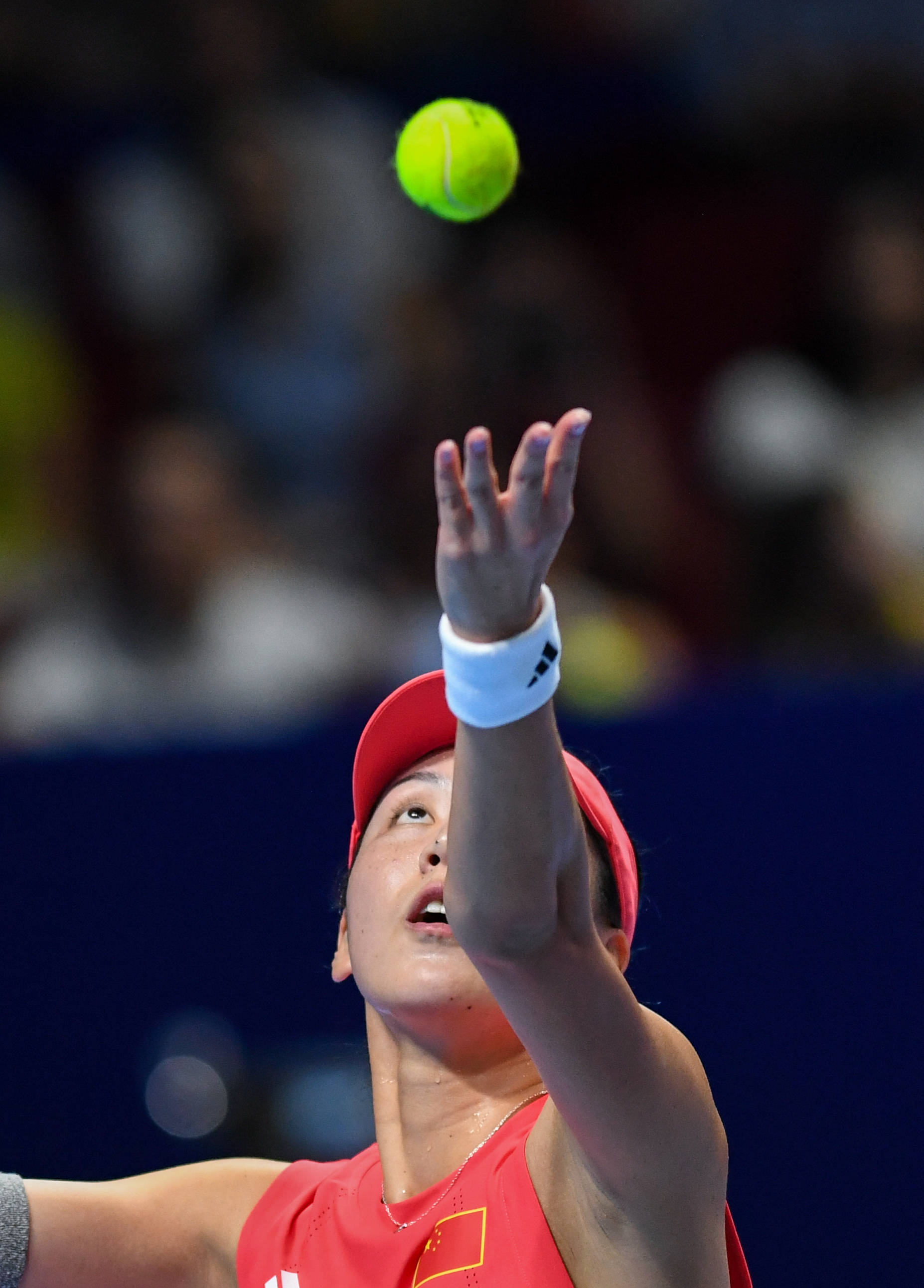 9月16日,中国队选手王欣瑜在第二场单打比赛中发球。最终她1比2不敌意大利队选手保利尼。 新华社记者 毛思倩 摄