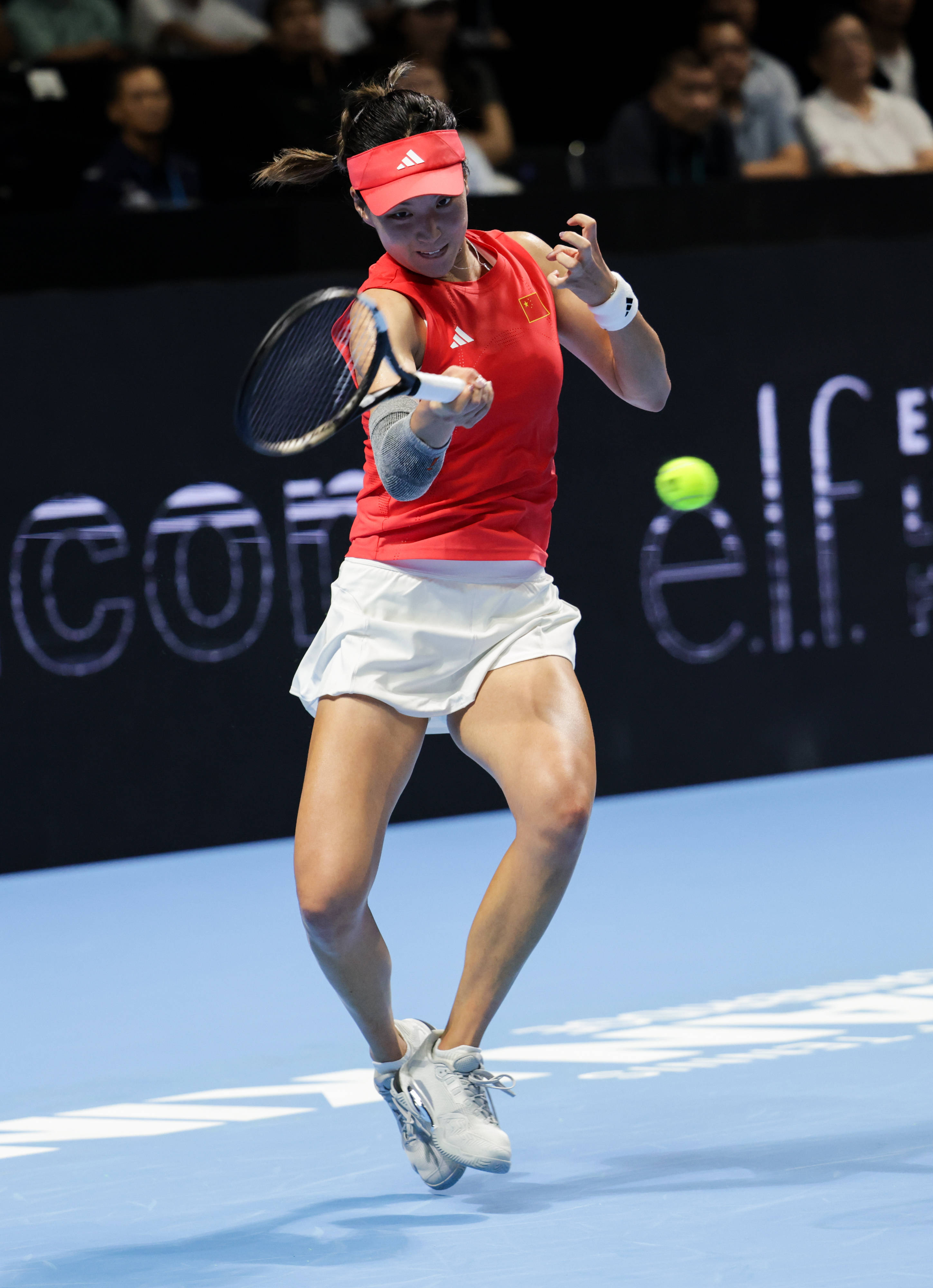 9月16日,意大利队选手保利尼在第二场单打比赛中回球。最终她2比1战胜中国队选手王欣瑜。 新华社记者 毛思倩 摄