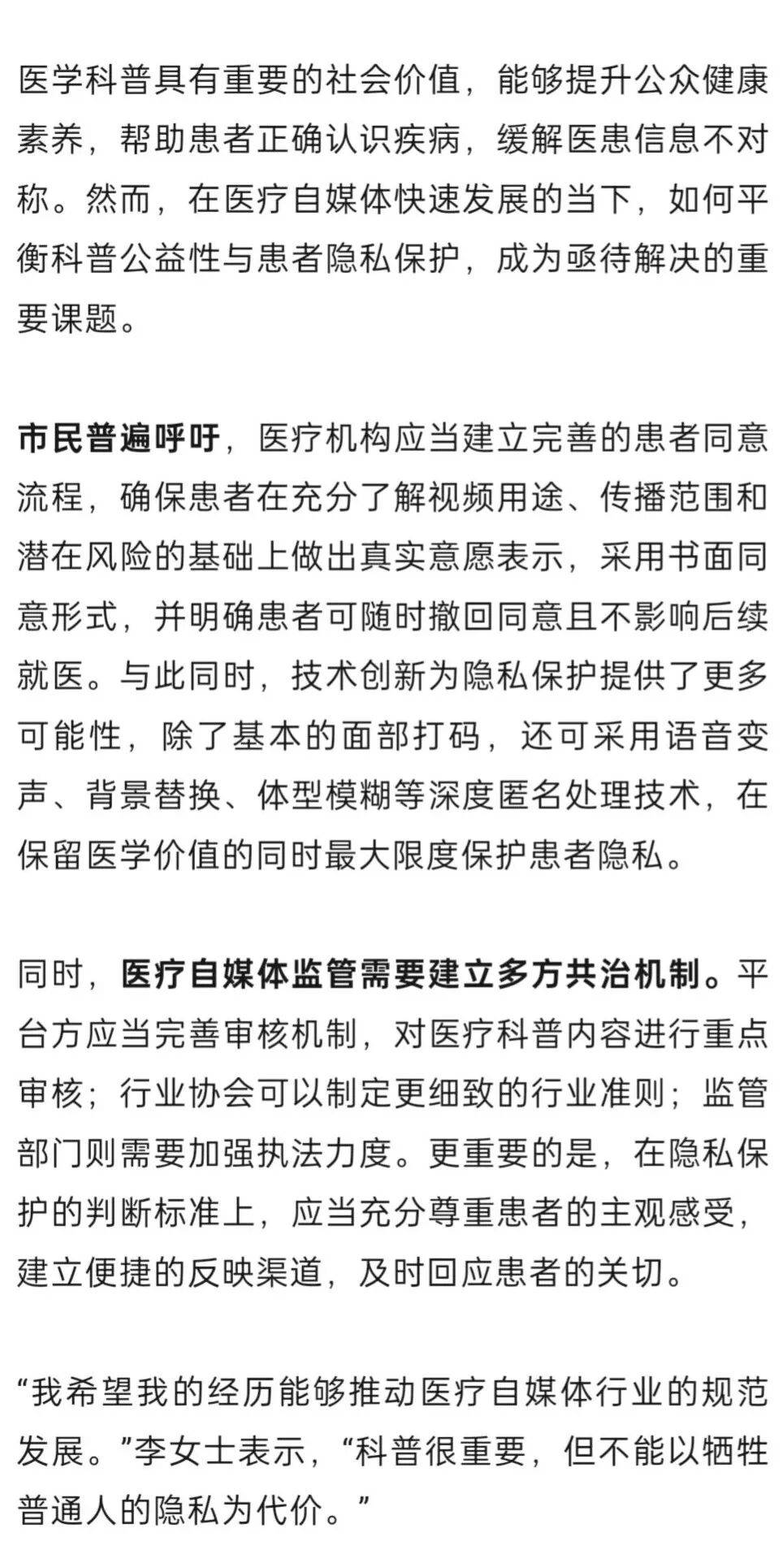 许多医疗自媒体创作者认为,只要对患者面部进行打码处理就已尽到隐私保护义务,这也是医疗自媒体的普遍做法。但在部分患者看来,这种做法存在明显局限:一方面,仅对面部进行处理无法有效隐匿患者的其他身份特征,如衣着特征、声音音色、病史信息等;另一方面,诊疗过程中透露的工作类别、居住区域、生活习惯等细节信息,都可能成为识别患者身份的关键线索。李女士的朋友,正是因为视频没有隐匿的身份特征,认出了她的身份。