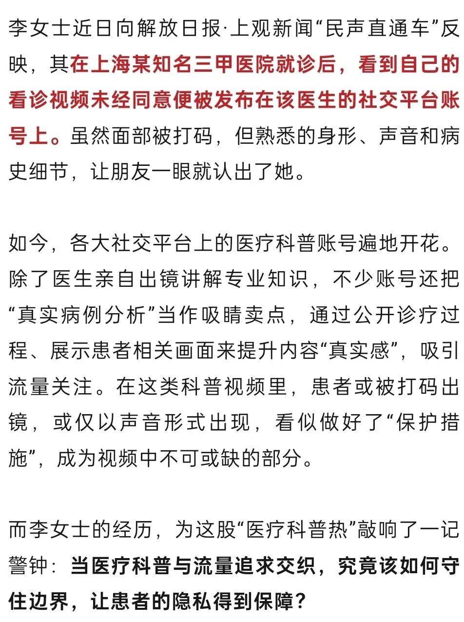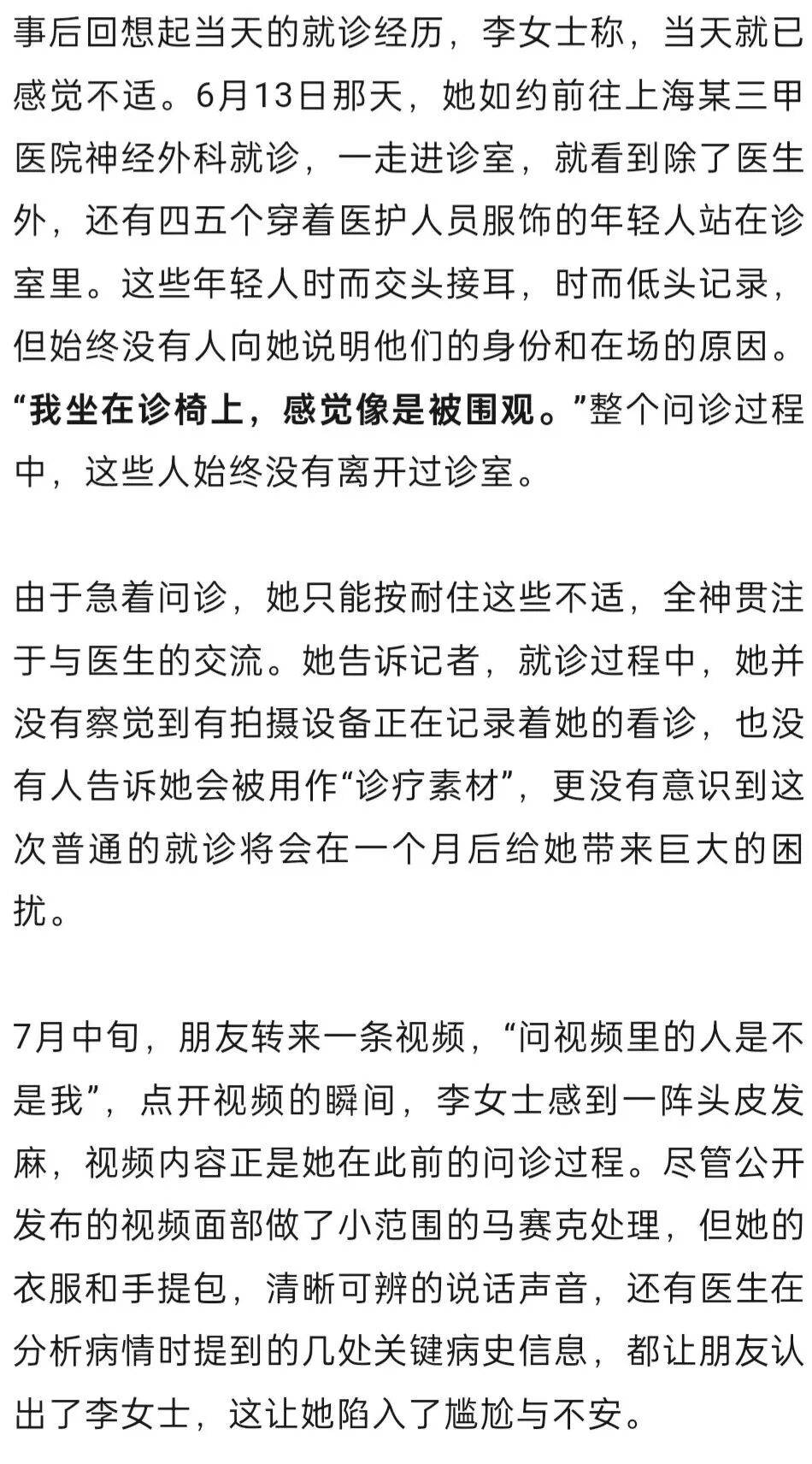 “太生气了,我感觉自己的隐私被彻底侵犯了。”回忆起看到视频的那一刻,李女士的语气依然激动。“我当时整个人都懵了。从进入诊室到离开,没有任何人提示我有可能被拍摄,更不用说征求我的明确同意了。”李女士向记者强调,“看病是极其私密的事,谁愿意未经同意就把它公之于众?”