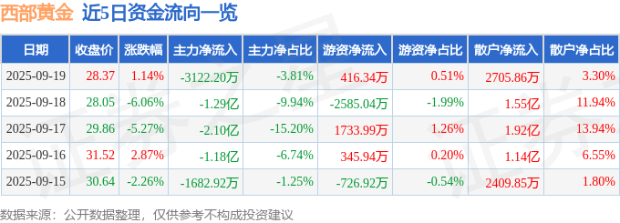 证券之星消息,截至2025年9月19日收盘,西部黄金(601069)报收于28.37元,上涨1.14%,换手率3.27%,成交量28.99万手,成交额8.2亿元。