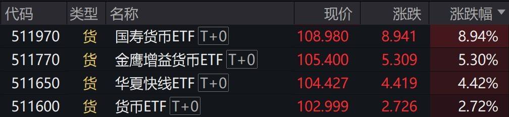 多只货币ETF午后异动拉升,国寿货币ETF涨约9%,金鹰增益货币ETF涨超5%。