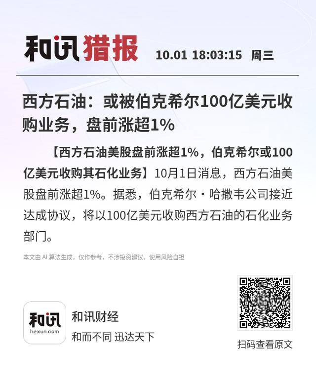 【西方石油美股盘前涨超1%,伯克希尔或100亿美元收购其石化业务】10月1日消息,西方石油美股盘前涨超1%。据悉,伯克希尔·哈撒韦公司接近达成协议,将以100亿美元收购西方石油的石化业务部门。