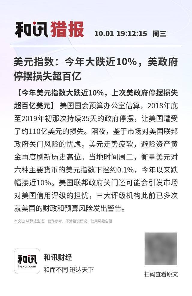 【今年美元指数大跌近10%,上次美政府停摆损失超百亿美元】美国国会预算办公室估算,2018年底至2019年初那次持续35天的政府停摆,让美国遭受了约110亿美元的损失。隔夜,鉴于市场对美国联邦政府关门风险的忧虑,美元走势疲软,避险资产黄金再度刷新历史高位。当地时间周二,衡量美元对六种主要货币的美元指数下挫约0.1%,今年以来跌幅接近10%。美国联邦政府关门还可能会引发市场对美国信用评级的担忧,三大评级机构此前已多次就美国的财政和预算风险发出警告。