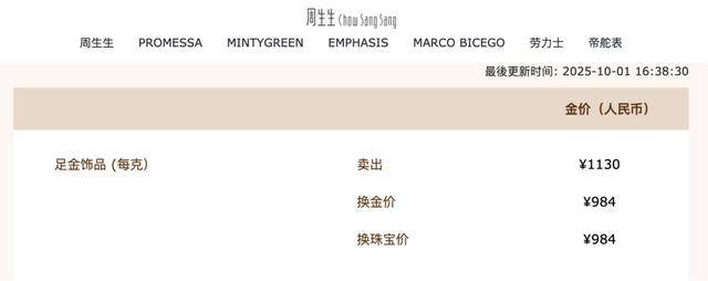 10月1日,记者在黄金珠宝品牌周生生官网看到,其当日足金饰品报价已达到1130元/克,周大福的报价也达到1129元/克。