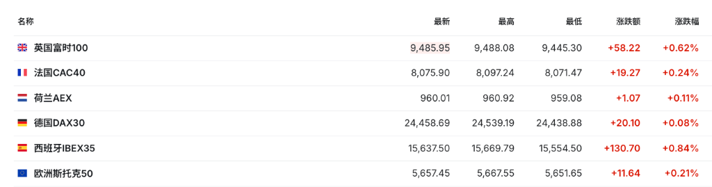• 欧洲斯托克50指数开盘涨0.35%,英国富时100指数涨0.49%,法国CAC 40指数涨0.28%,德国DAX指数涨0.18%。