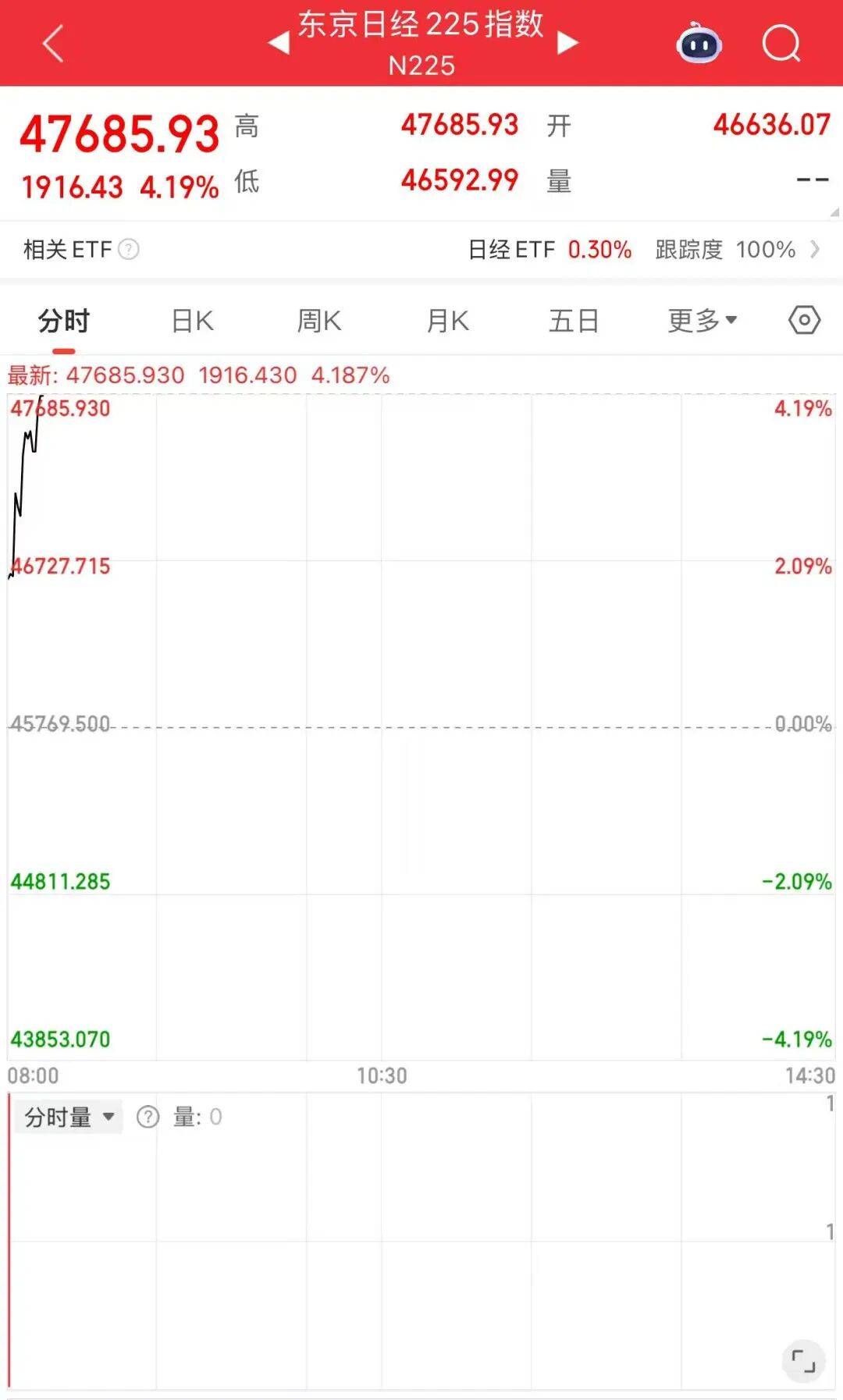 日经225指数高开,首次站上47000点,随后延续涨势,日内涨超4%,报47685.93点;日本东证指数涨超3%,报3224.27点。日经225指数、日本东证指数均创历史新高。