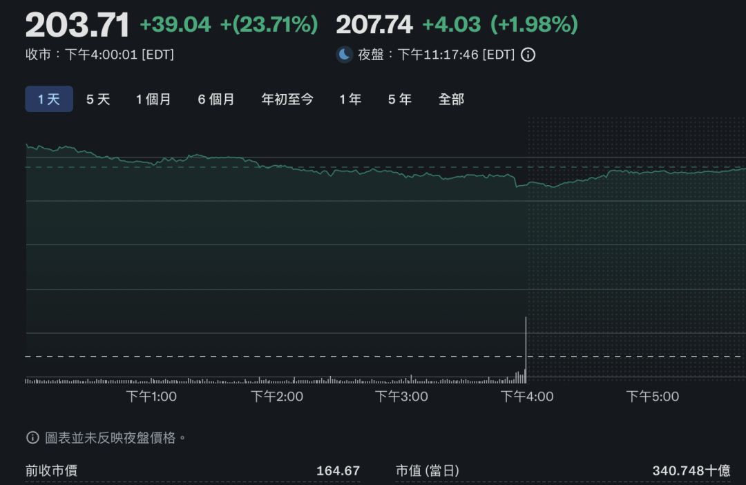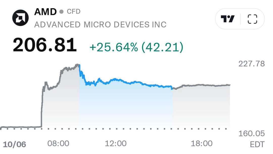 OpenAI与AMD合作的消息一经公布,资本市场迅速作出反应。美东时间周一盘前,AMD股价飙升近25%,最高触及近207美元高位。