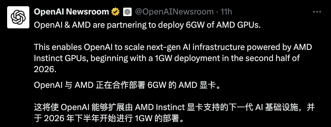 OpenAI将部署6GW AMD GPU算力