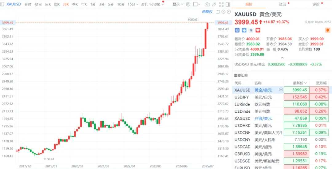 现货黄金突破4000美元/盎司大关,续创新高,年内大涨近1400美元/盎司,涨幅超52%。