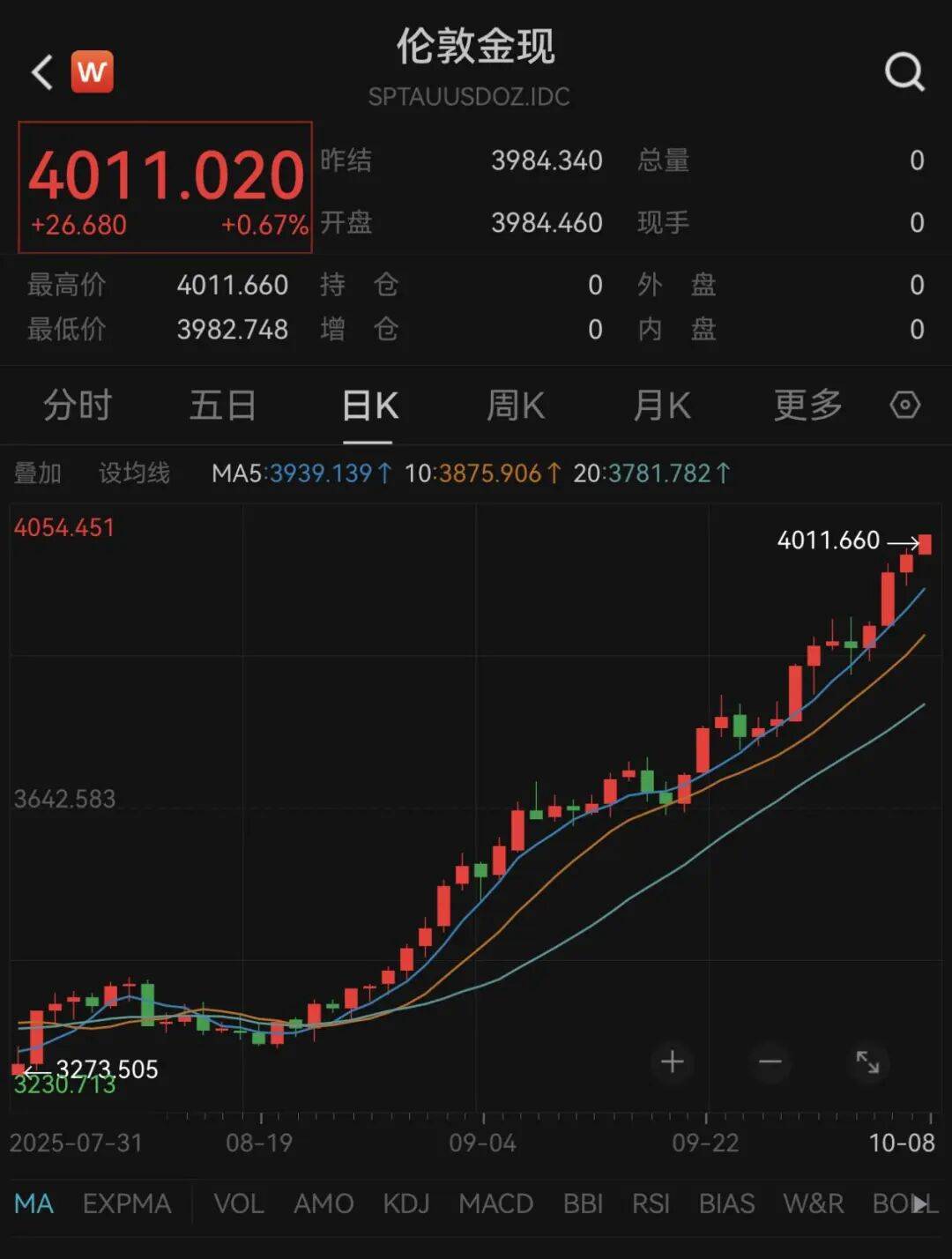 现货黄金突破4000美元/盎司大关,续创新高,年内涨幅超52%。