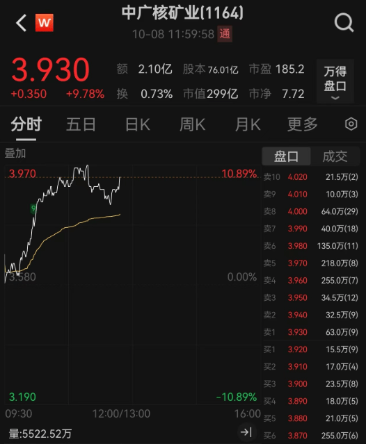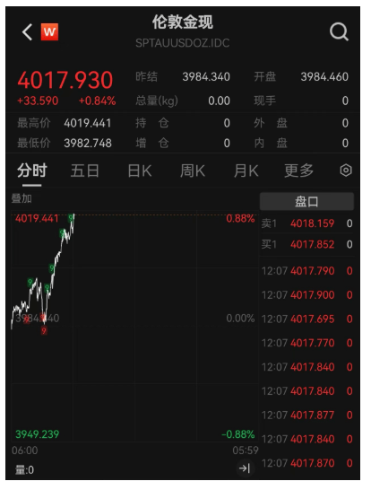 消息面上,国际金价持续上行,创历史新高。截至北京时间10月8日12:07,COMEX黄金期货上涨0.76%,报4035美元/盎司;伦敦现货黄金涨0.84%,报4017.93美元/盎司,两者盘中最高分别触及4038.7美元/盎司、4019.441美元/盎司,其中伦敦现货黄金为历史上首次升破4000美元/盎司关口。