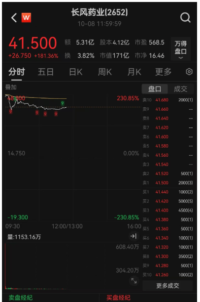 今日,长风药业在港股市场上市交易,首日表现强劲。该股开盘报47港元/股,较发行价涨超218%,盘中最高涨至48.8港元/股。截至上午收盘,长风药业涨181.36%,报41.5港元/股。