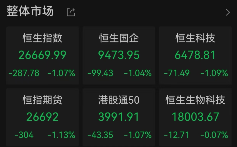 截至今天上午收盘,恒生指数跌1.07%,恒生国企指数跌1.04%,恒生科技指数跌1.09%。