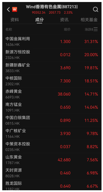 今天上午,Wind香港有色金属概念指数涨超2%。其中,赤峰黄金涨超14%,山东黄金涨超7%,紫金黄金国际涨近6%,潼关黄金涨超4%,灵宝黄金涨超3%。赤峰黄金、山东黄金、紫金黄金国际、灵宝黄金盘中均创新高。