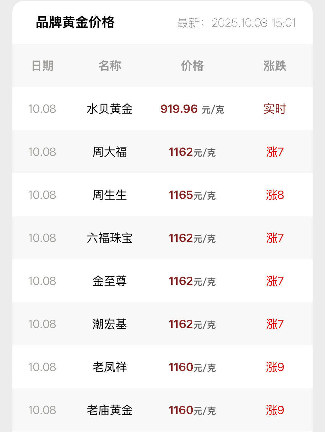 10月8日,记者从部分品牌金饰门店了解到,目前千足金饰品的价格普遍已经涨至每克1160元,周大福、六福珠宝、周大生饰品报1162元/克,周生生足金饰品最高报1165元/克,以此计算,国庆假期8天国内金饰克重涨了近40元。