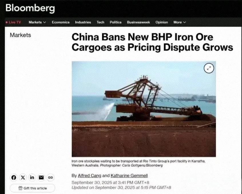 2025年9月,中国矿产资源集团宣布,暂停采购必和必拓所有以美元计价的海运铁矿石,并要求从此用人民币结算。这一举措表面上看是中澳之间的贸易摩擦,但其实深层次的意义远远超出了简单的商业争端。这不仅是对澳大利亚的精准反击,也间接对美国的美元霸权发起了挑战。