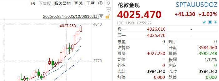 截至发稿,伦敦金现报4025.47美元/盎司,涨逾1%,年内涨幅超53%。