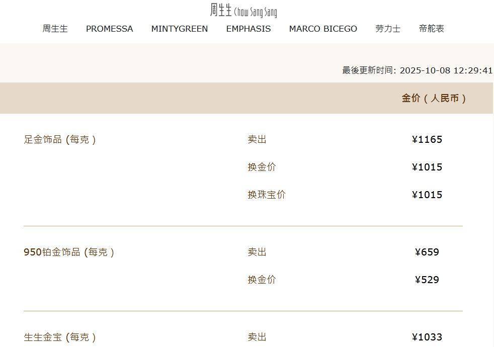 记者注意到,截至目前,周大福足金(饰品、工艺品类)价格为1162元/克,较10月1日(1129/克)上涨33元。周生生足金饰品价格为1165元/克,较10月1日(1130/克)上涨35元。老凤祥足金饰品价格为1160元/克,较10月1日(1125元/克)上涨35元。