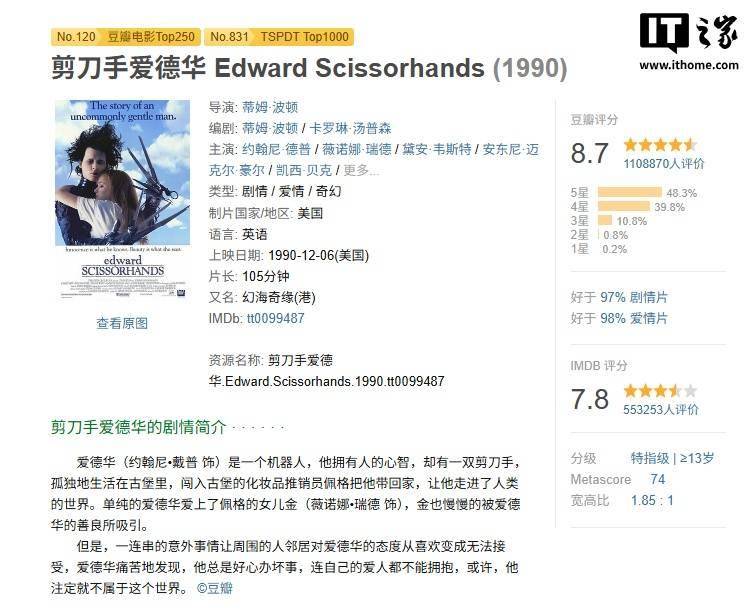 IT之家 10 月 8 日消息,随着万圣节临近,20 世纪影业宣布推出蒂姆・伯顿执导、约翰尼・德普主演的影视经典《剪刀手爱德华》35 周年纪念版。