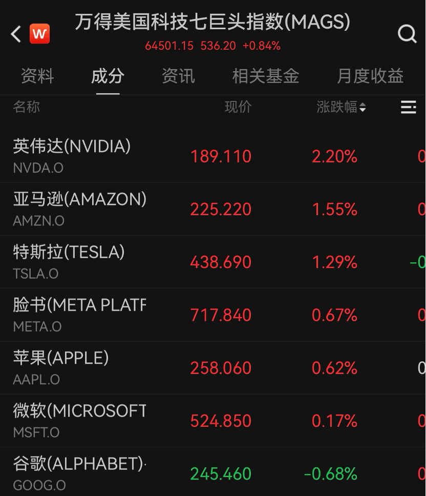 大型科技股多数上涨,万得美国科技七巨头指数上涨0.84%。个股方面,英伟达涨超2%,亚马逊、特斯拉涨逾1%。