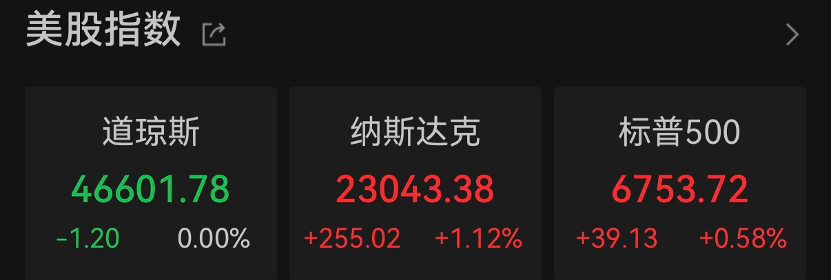 Wind数据显示,当地时间10月8日,美股三大股指涨跌不一。截至收盘,道指微跌,报46601.78点;标普500指数涨0.58%报6753.72点,纳指涨1.12%报23043.38点。其中,标普500指数、纳指创收盘新高。