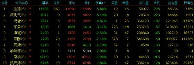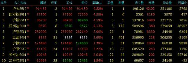 2025年10月9日,国内期货主力合约涨多跌少。沪金、棕榈油、沪铜、国际铜涨超4%,沪锡、豆油、沪镍、沪银涨超2%;跌幅方面,生猪、液化石油气(LPG)跌超5%,鸡蛋跌超4%,尿素跌超3%,烧碱、甲醇、丙烯跌超2%。
