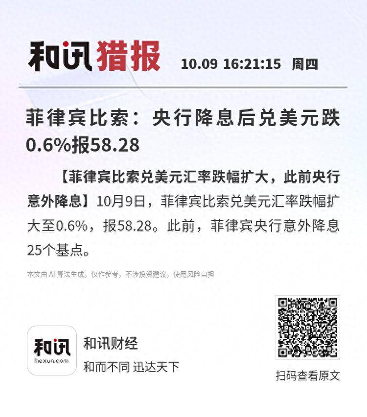 【菲律宾比索兑美元汇率跌幅扩大,此前央行意外降息】10月9日,菲律宾比索兑美元汇率跌幅扩大至0.6%,报58.28。此前,菲律宾央行意外降息25个基点。