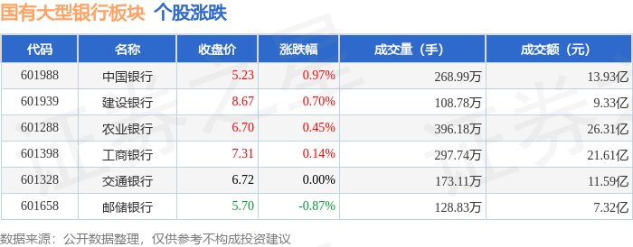证券之星消息,10月9日国有大型银行板块较上一交易日上涨0.34%,中国银行领涨。当日上证指数报收于3933.97,上涨1.32%。深证成指报收于13725.56,上涨1.47%。国有大型银行板块个股涨跌见下表: