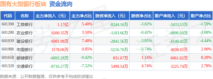 从资金流向上来看,当日国有大型银行板块主力资金净流入1.34亿元,游资资金净流出1.11亿元,散户资金净流出2344.64万元。国有大型银行板块个股资金流向见下表: