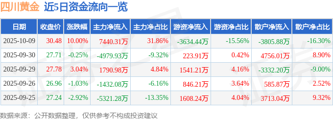 证券之星消息,四川黄金10月9日涨停收盘,收盘价30.48元。该股于9点25分涨停,未打开涨停,截止收盘封单资金为2.03亿元,占其流通市值2.31%。