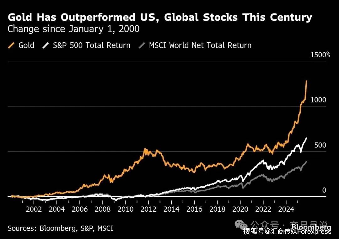 10月8日纽约时段,现货黄金刷新历史新高4059美元,创下今年第41个历史新高。本轮涨势标志着金价迎来一个重要的里程碑,其价格已较两年前的每盎司2000美元正式翻了一番。自本世纪初以来,金价的表现远超全球股市,回报率超过1200%。
