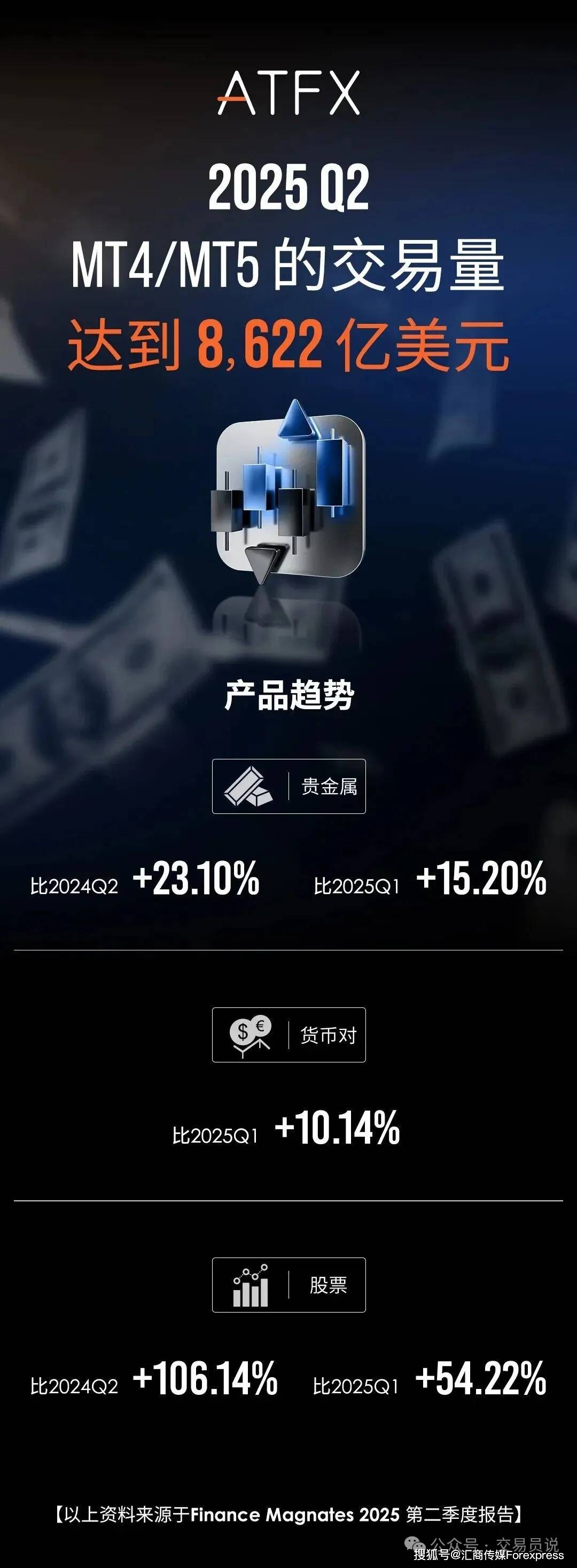 多年以来,ATFX以其用户友好的平台和强大的技术功能而闻名,成为全球贵金属交易的首选。ATFX在Finance Magnates 2025年第二季度报告中展示了其卓越的市场表现,ATFX在MT4/MT5交易平台上的交易量飙升,季度交易总额取得惊人的8622亿美元,持续稳居全球交易量前十强榜单。自2020年9月首度跻身全球前十以来,ATFX已连续20个季度保持这一领先地位,展现出惊人的发展速度和无限潜力。