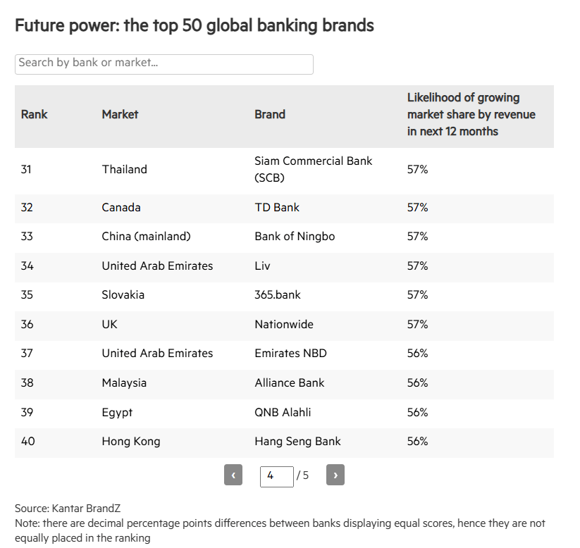 该榜单由凯度(Kantar)和英国银行家杂志联合发布,根据客户感知来评判银行在未来12个月内的品牌价值增速,是否获得了与其规模相符的良好品牌资产得分,即该银行是否正在有效地打造其品牌。