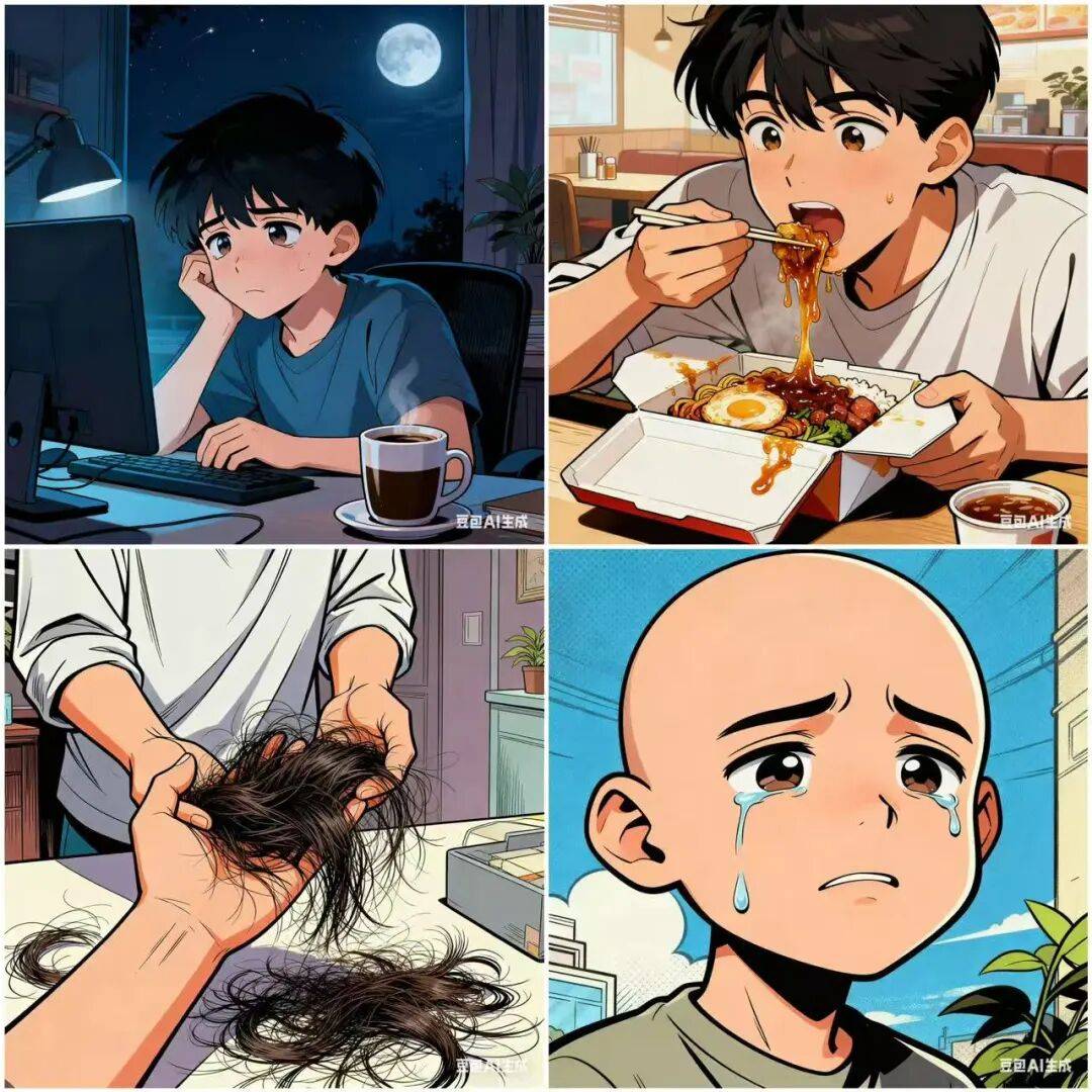 张玉辉介绍说,虽然这类雄秃患者约70%有家族遗传背景,但不良生活习惯如同催化剂,极大地加速和加重了脱发进程熬夜会导致雄激素分泌增加,双氢睾酮在毛囊根部积累,直接攻击毛囊;高油高脂的饮食会刺激皮脂过度分泌,堵塞毛囊口,形成双重打击;精神压力会内耗免疫力。这三者叠加,就构成了脱发“三大杀手”。