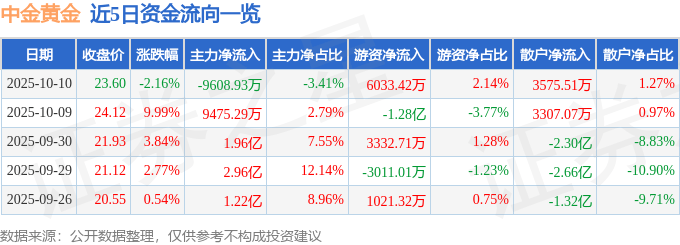 股票行情快报:中金黄金(600489)10月10日主力资金净卖出9608.93万元