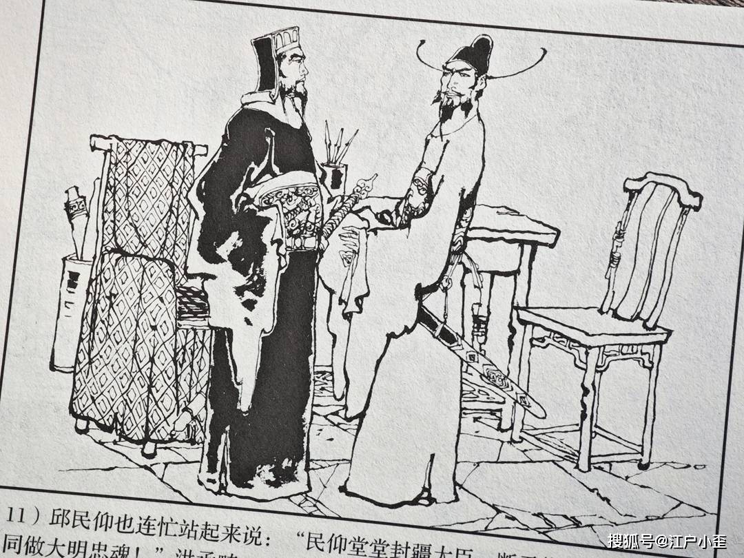 后面那位帽翅翘起来的是辽东巡抚邱民仰,他也是一位忠臣,很有气节,最后慨然赴死。