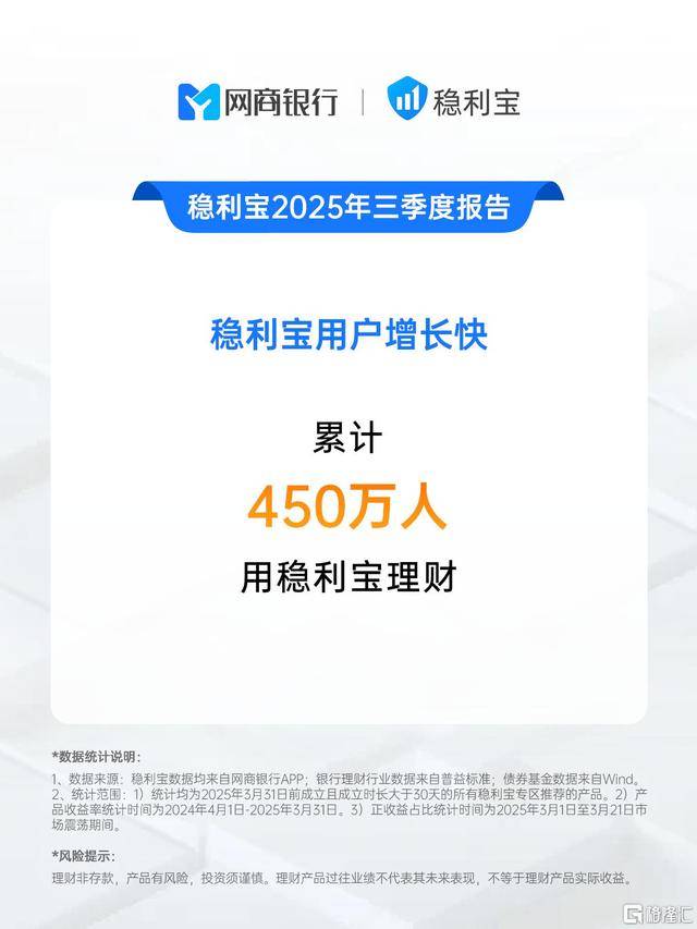 以网商银行旗下“稳利宝”平台为例,其2025年三季度报告进一步揭示了用户行为的微观特征。截至9月末,平台用户规模达450万人,较年初增长67%。用户投资行为也呈现出黏性增强的特征,约三分之二的新用户进行复投,超七成用户在复购时会增加投资金额。这一方面说明用户对平台及产品策略的认可,另一方面也反映出理财习惯从“一次性尝试”向“持续性配置”转变的趋势。