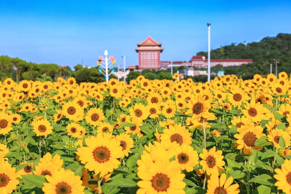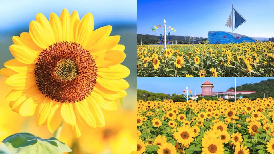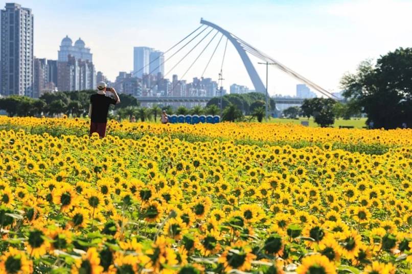 「大佳河滨公园」地点位于台北市中山桥、大直桥之间,每年秋天都有不同主题的花海接力登场,今年第一波由最受欢迎的「向日葵」打头阵,种植「橙花黑心」「橙花黄心」2个品种的向日葵,总数超过18万株,花海面积超过1500坪,规模比往年增加4倍!过去向日葵花海大约10月才会盛开,今年提早半个月,开花率也超过半数,预估今年「最佳赏花期」会落在9月底~10月初,民众可以把握好天气出门赏花!未来还会有百日草、波斯菊花海接力绽放!