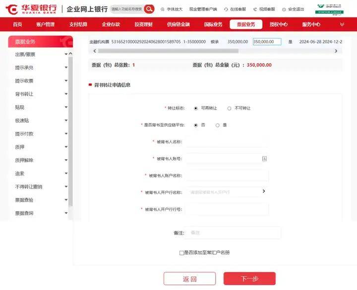接下来点击 票据业务 - 背书转让,进入背书转让申请信息页面,选择需要背书转让的新一代票据,根据实际需要输入背书转让的金额,转让标志选择“可再转让”,是否背书至供应链票据平台选择“否”,输入被背书人名称,被背书人账号,被背书人账户名称,被背书人开户行名称和被背书人开户行行号,确认无误后,再点“下一步”。按提示输入密码,再点“OK”完成经办操作。