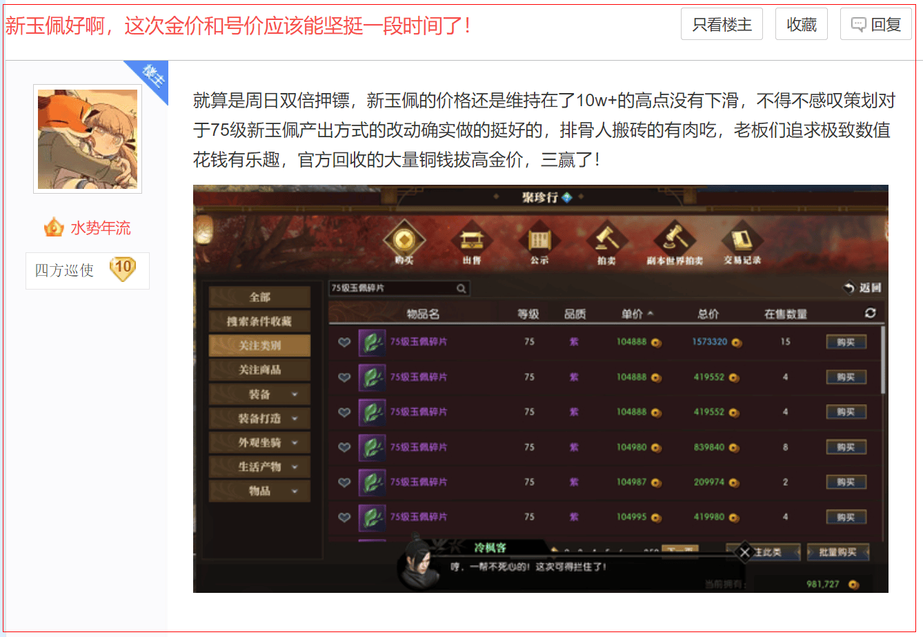 不过和其他游戏不同,浮夸在《逆水寒》黄金服内投入的资金,最终都被其他玩家赚走,例如国庆节前,《逆水寒》更新了新资料片“夺金盛宴”,并在黄金服内开放了全新的75级玉佩系统,大批神豪纷纷开始砸钱,瞬间整个黄金服物价、金价都迅速飙升。