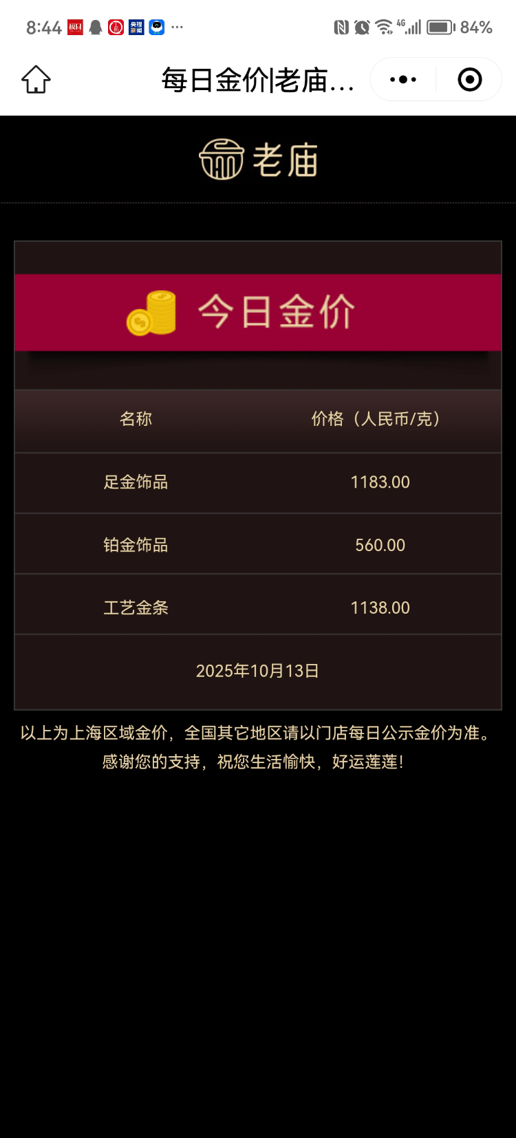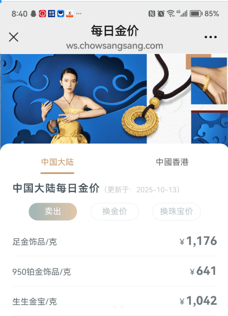 10月13日,上游新闻记者查询发现,国内品牌金饰价格克价已经突破1180元。老凤祥足金饰品克价为1172元;周生生足金饰品克价为1176元;周大福足金(饰品、工艺品类)克价为1180元;老庙黄金足金饰品克价为1183元。