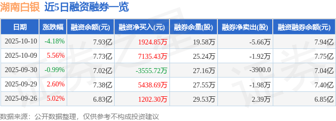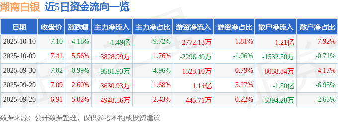 证券之星消息,截至2025年10月10日收盘,湖南白银(002716)报收于7.1元,下跌4.18%,换手率9.79%,成交量214.66万手,成交额15.33亿元。