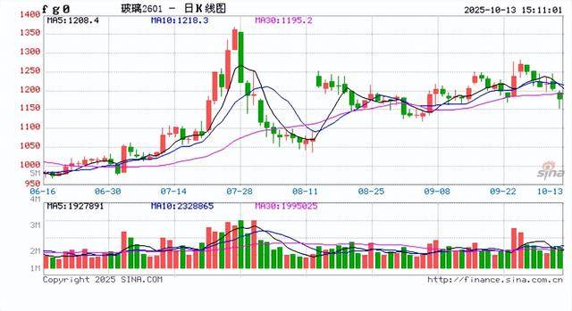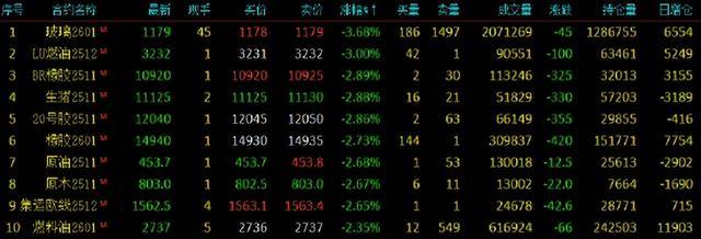 2025年10月13日,国内期货主力合约涨跌互现。玻璃跌近4%,低硫燃料油(LU)下跌3%,丁二烯橡胶、生猪、20号胶、橡胶跌近3%;涨幅方面,沪银、甲醇涨超2%,沪金、铁矿石、花生涨超1%。