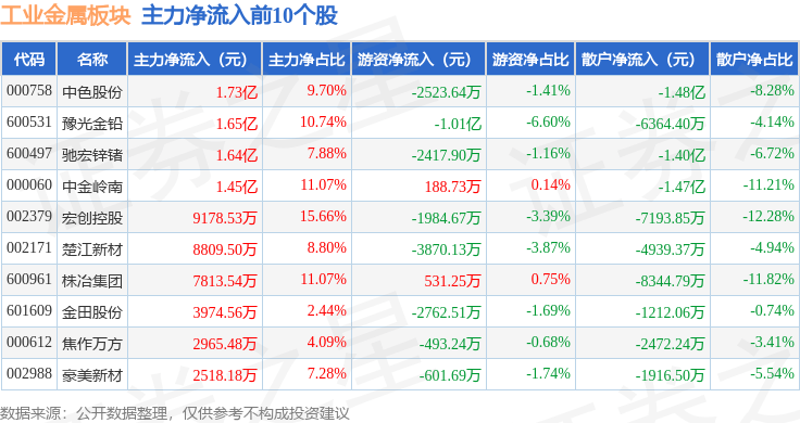 从资金流向上来看,当日工业金属板块主力资金净流出22.1亿元,游资资金净流入8.42亿元,散户资金净流入13.69亿元。工业金属板块个股资金流向见下表: